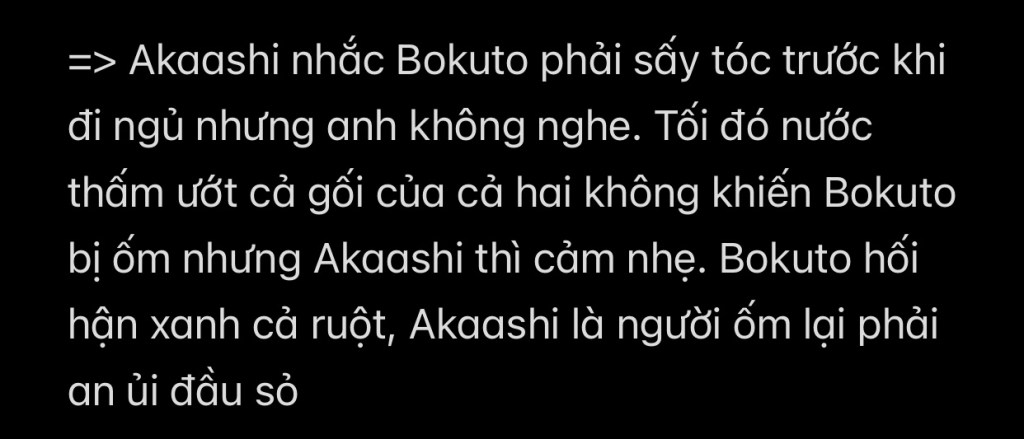Akaashi bị giật mình vì câu trả lời đột ngột của anh, đồng thời cậu cũng cảm thấy cạn lời trước khả năng sử dụng từ ngữ của Bokuto. Tuy không biết anh học đâu ra từ đó, cậu cũng chẳng buồn tranh cãi với anh mà lập tức mệt mỏi ngả người xuống giường ngủ luôn để lại Bokuto ngơ ngác nhìn bóng lưng lạnh lùng của Akaashi. Anh ngẫm lại xem có phải mình vừa chọc giận cậu không nhưng nghĩ mãi mà vẫn không thấy cậu tức chỗ nào nên đành thôi, chỉ đoán rằng hôm nay cậu dễ tính hơn bình thường rồi an tâm ôm Keiji ngủ, tóc ướt thấm vào gối lan sang cả chỗ cậu nằm.